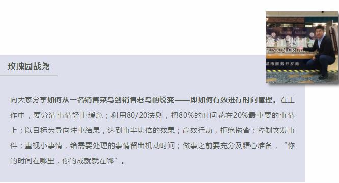 各項(xiàng)目共十余位銷售精英根據(jù)自身經(jīng)驗(yàn)為大家?guī)?lái)一場(chǎng)銷售上的饕餮盛宴。分享內(nèi)容包括時(shí)間管理、專業(yè)修煉、陽(yáng)光心態(tài)、有效溝通等方面,營(yíng)銷總監(jiān)王總就各銷售精英分享的經(jīng)驗(yàn),進(jìn)行點(diǎn)評(píng)和補(bǔ)充,也用親身經(jīng)歷向在座的各位銷售人員傳授自身經(jīng)驗(yàn),使大家受益匪淺。