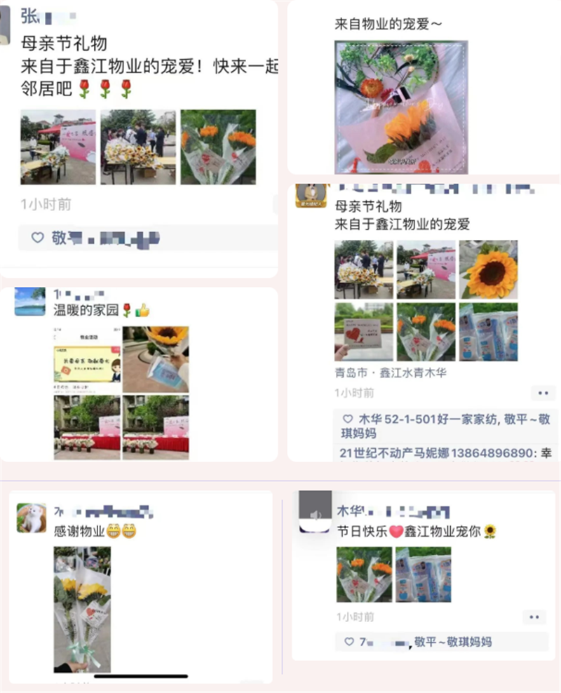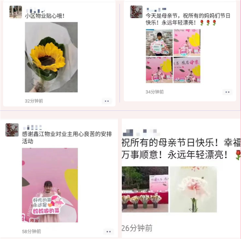 業(yè)主們將充滿溫情的活動現(xiàn)場,記錄在了朋友圈里,讓我們一起來看看,鑫家人的母親節(jié)是怎樣成功出圈的吧!