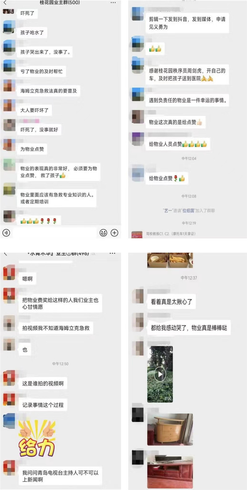 小區(qū)門口救人的視頻隨即在小區(qū)業(yè)主群里傳開,得到了業(yè)主們不計其數(shù)的贊許與敬佩,就連隔壁小區(qū)的業(yè)主群都紛紛點(diǎn)贊,稱胡瑞杰為“女中豪杰”。